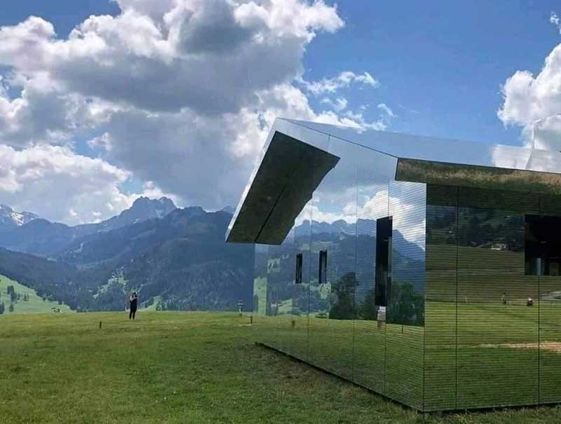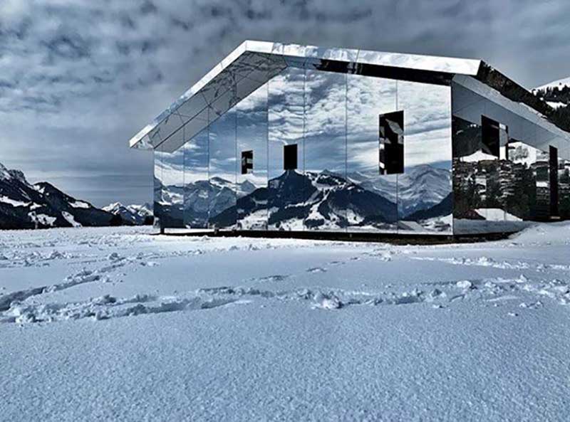 Američki umetnik Doug Aitken stvorio je jedinstvenu instalaciju imena Mirage Gstaad, koja izgleda kao jednostavna kuća, osim činjenice da je prekrivena velikim ogledalima. Konstrukcija se stapa s prirodom u švajcarskom Gstaadu i nikad ne izgleda isto.