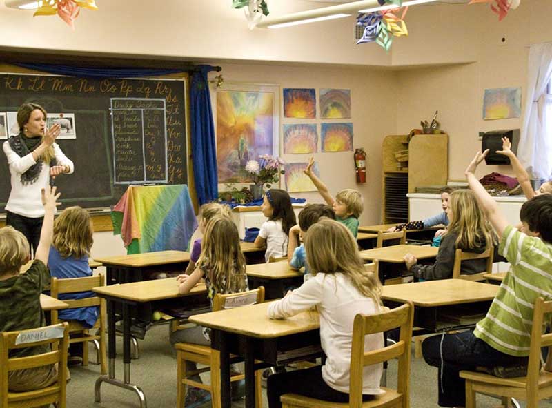 U učionici učitelj pozdravlja svako dete rukujući se, a zatim iznosi plan za taj dan. Deca odmah znaju koju će priču slušati, kada će se pevati pesme te kada će uslediti vežbe. Uz osnovna znanja, polaznici Waldorf škole takođe uče da plešu, tkaju, sviraju razne muzičke instrumente i pesnički razmišljaju. Budući da je očuvanje detinjstva od najveće važnosti, učenici se ne forsiraju, a čitanje se često ne podstiče do 3. razreda.